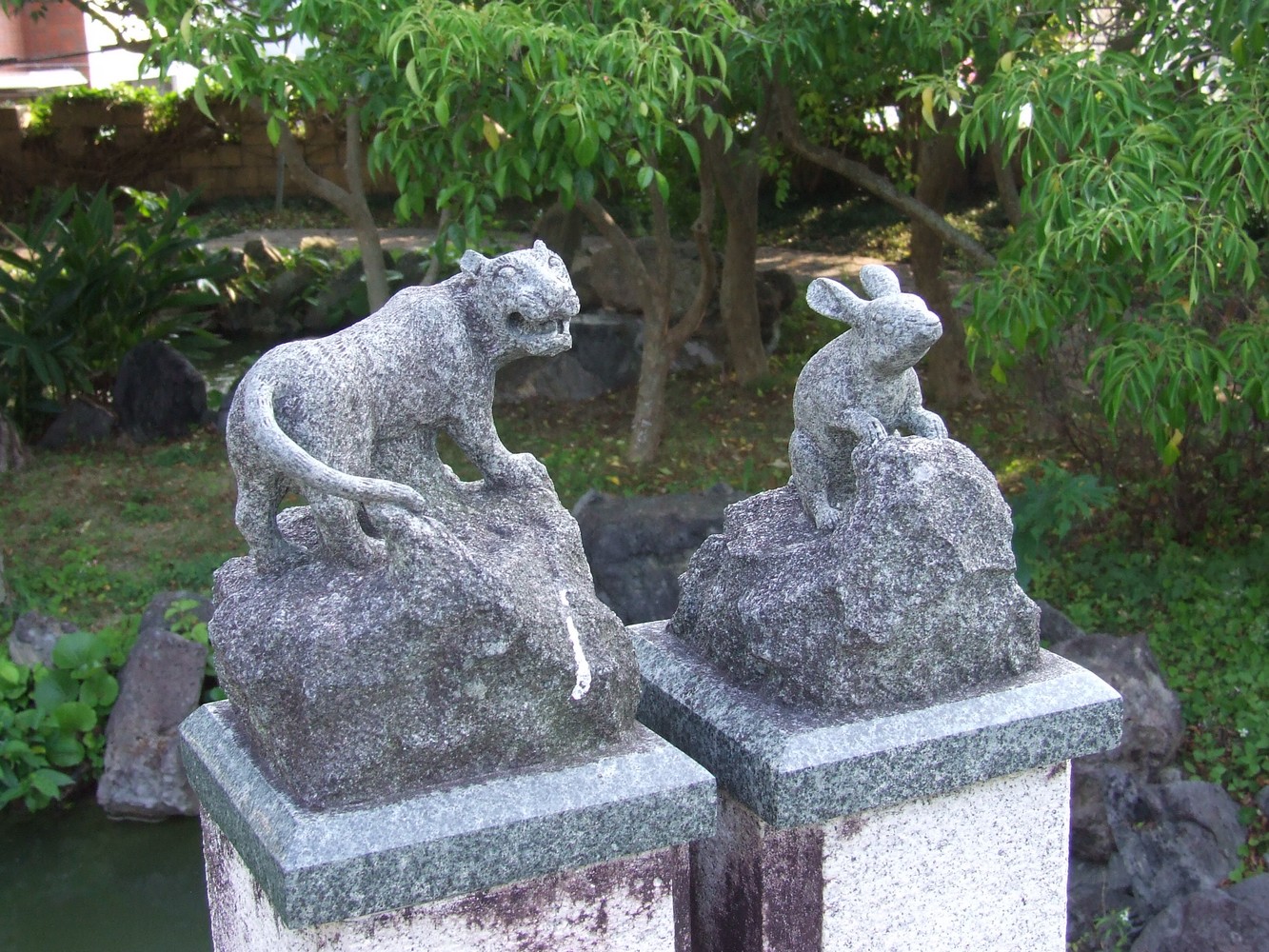 - A l’ouest, normalement le tigre blanc (élément Métal). La couleur blanche signale un animal magique à la longévité exceptionnelle. Peut être que cet oiseau pouvant ressembler à la grue fut présent avant ce tigre. En effet les chinois considéraient cet oiseau comme le patriarche de tous les animaux ailés. Les légendes racontent qu'elles pouvaient vivre 600 ans et donc symboliserait cette longévité. La grue est aussi symbole de sagesse et d'élévation de l'esprit dans la culture chinoise.
