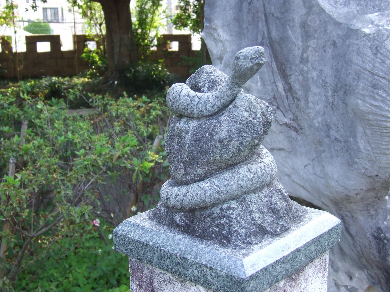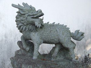 Deux portes rondes donnent accès à une grande place où trône une sculpture étrange en pierre qui semble avoir été érodée par le temps. Aux quatre coins cardinaux de ce lieu, nous retrouvons, sur une stèle et taillés dans la roche, quatre(ou cinq) animaux mythiques de l’ancienne Chine. Ce sont les gardiens des quatre orients.
